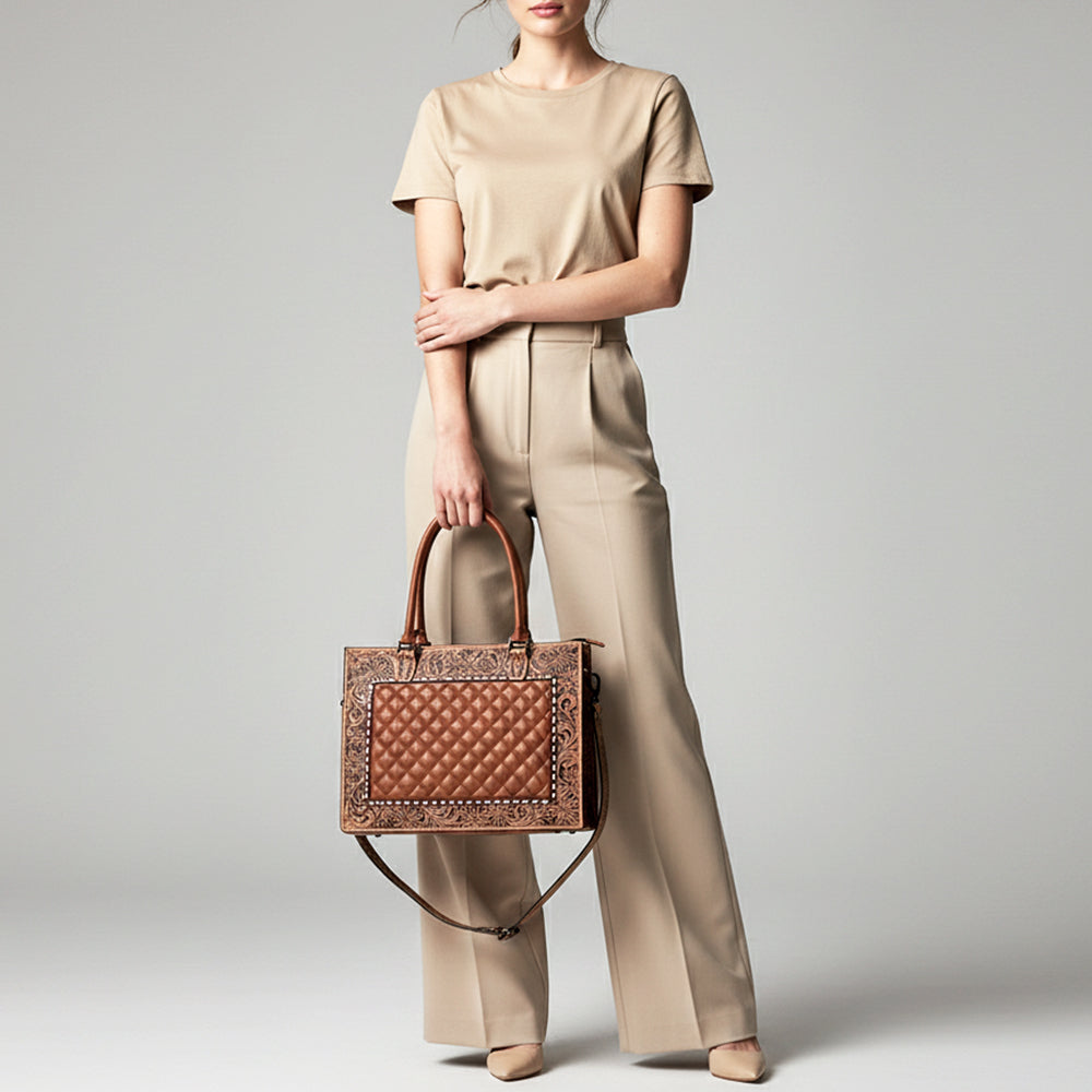 • This elegant design features a sophisticated Quilted center, framed by bold Hand Tooled, Floral Carved leather details and Buck stitching. Its spacious, Well-compartmentalized interior makes it a versatile Tote Bag perfect for everyday use or professional travel.