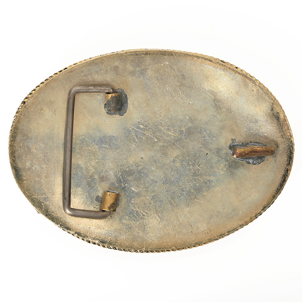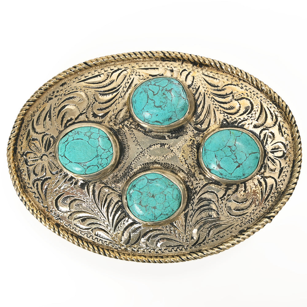 • Complete your Western look with this stunning American Darling Belt Buckle. The polished Brass surface is intricately adorned with detailed floral scrollwork patterns. A striking oval Turquoise Rhinestone, framed by a classic rope border. Measuring 2.75" H x 3.75" W, this buckle is the perfect size to make a bold, authentic Southwestern statement.
