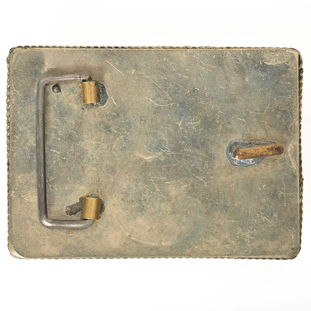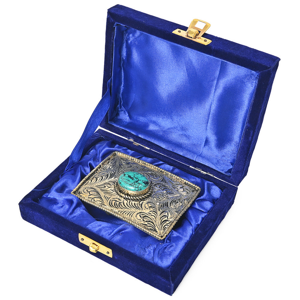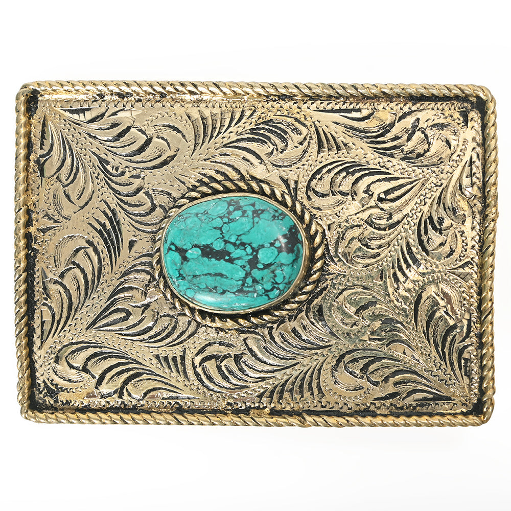 Complete your Western look with this stunning American Darling Belt Buckle. The polished Brass surface is intricately adorned with detailed floral scrollwork patterns. A striking oval Turquoise Rhinestone, framed by a classic rope border. Measuring 2.75" H x 3.75" W, this buckle is the perfect size to make a bold, authentic Southwestern statement.
