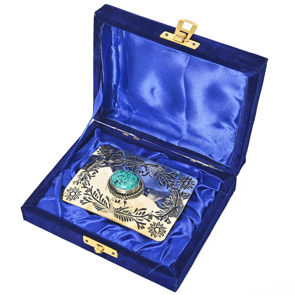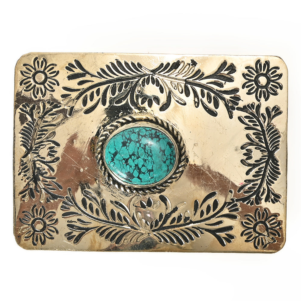 • Complete your Western look with this stunning American Darling Belt Buckle. The polished Brass surface is intricately adorned with detailed floral scrollwork patterns. A striking oval Turquoise Rhinestone, framed by a classic rope border. Measuring 2.75" H x 3.75" W, this buckle is the perfect size to make a bold, authentic Southwestern statement.