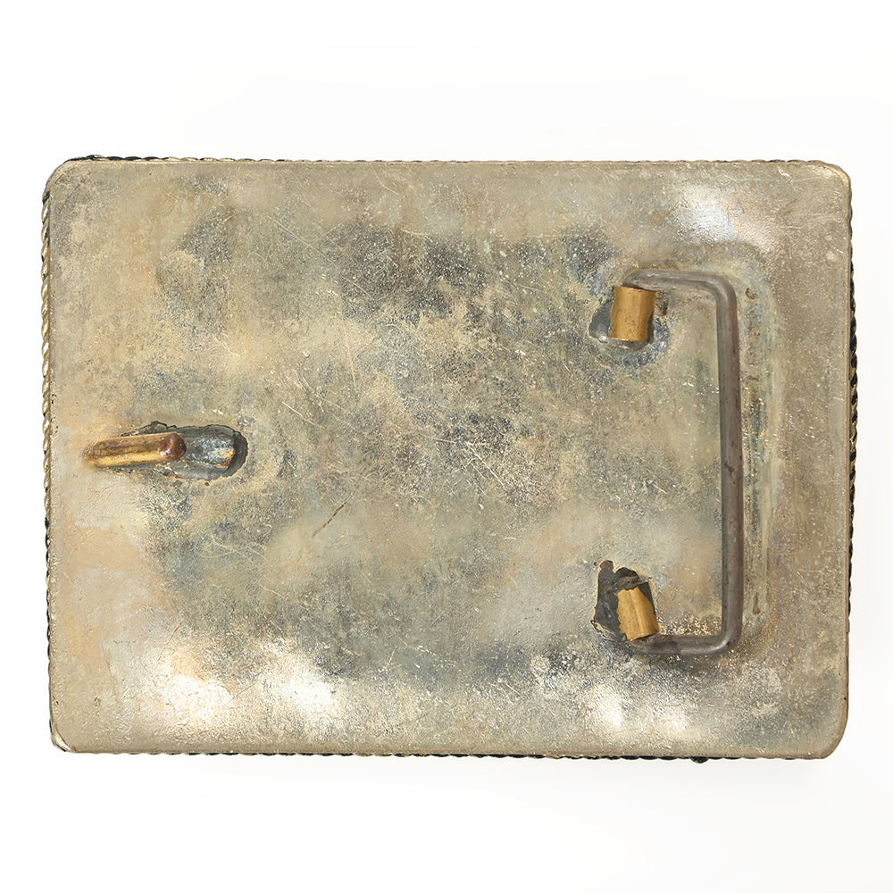 • Complete your Western look with this stunning American Darling Belt Buckle. The polished Brass surface is intricately adorned with detailed floral scrollwork patterns. A striking oval Turquoise Rhinestone, framed by a classic rope border. Measuring 2.75" H x 3.75" W, this buckle is the perfect size to make a bold, authentic Southwestern statement.