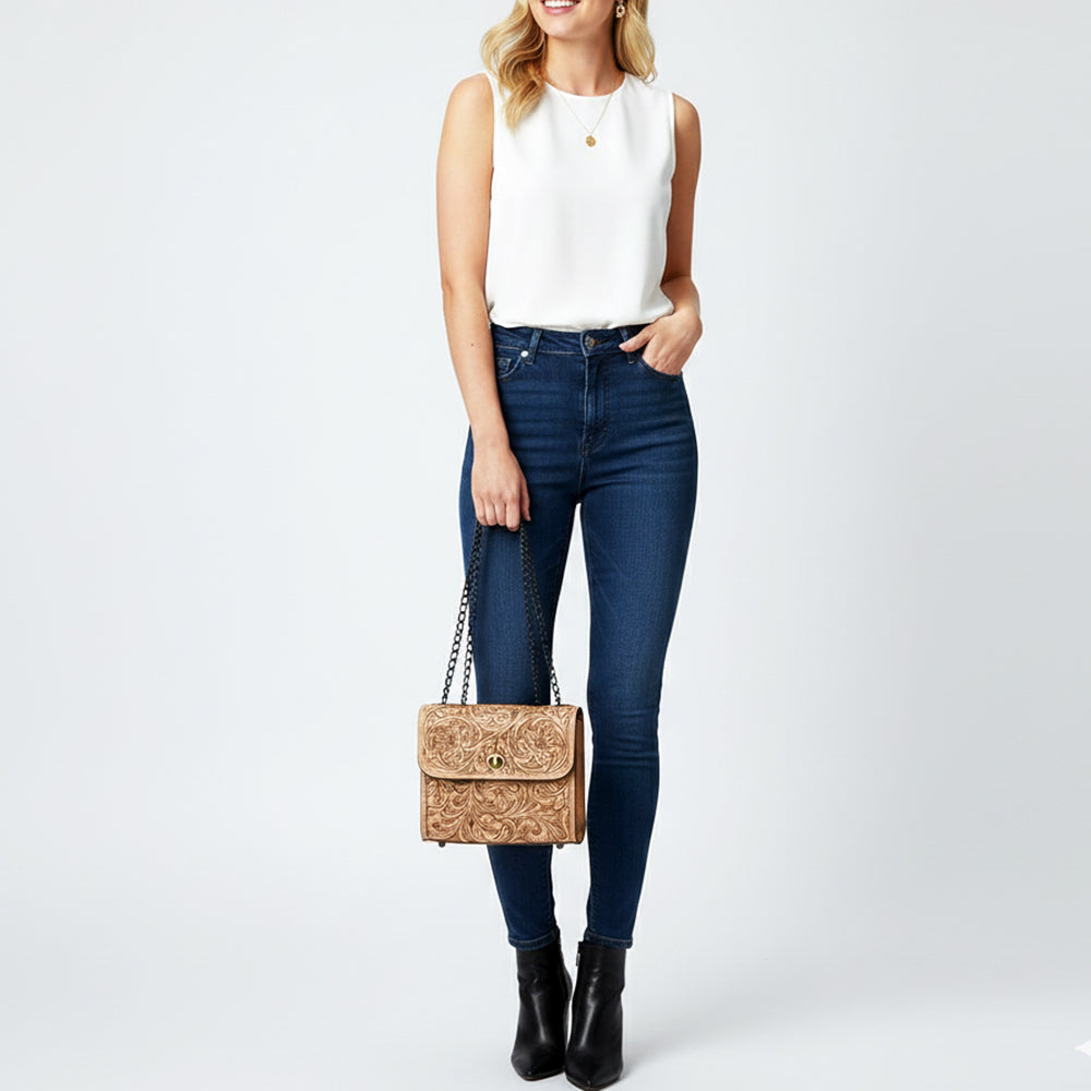 • Design & Functionality: Features intricate Western floral tooling, structured silhouette, and a durable chain strap. Designed as a Small Cross body Bag ideal for daily wear, travel, and special occasions.