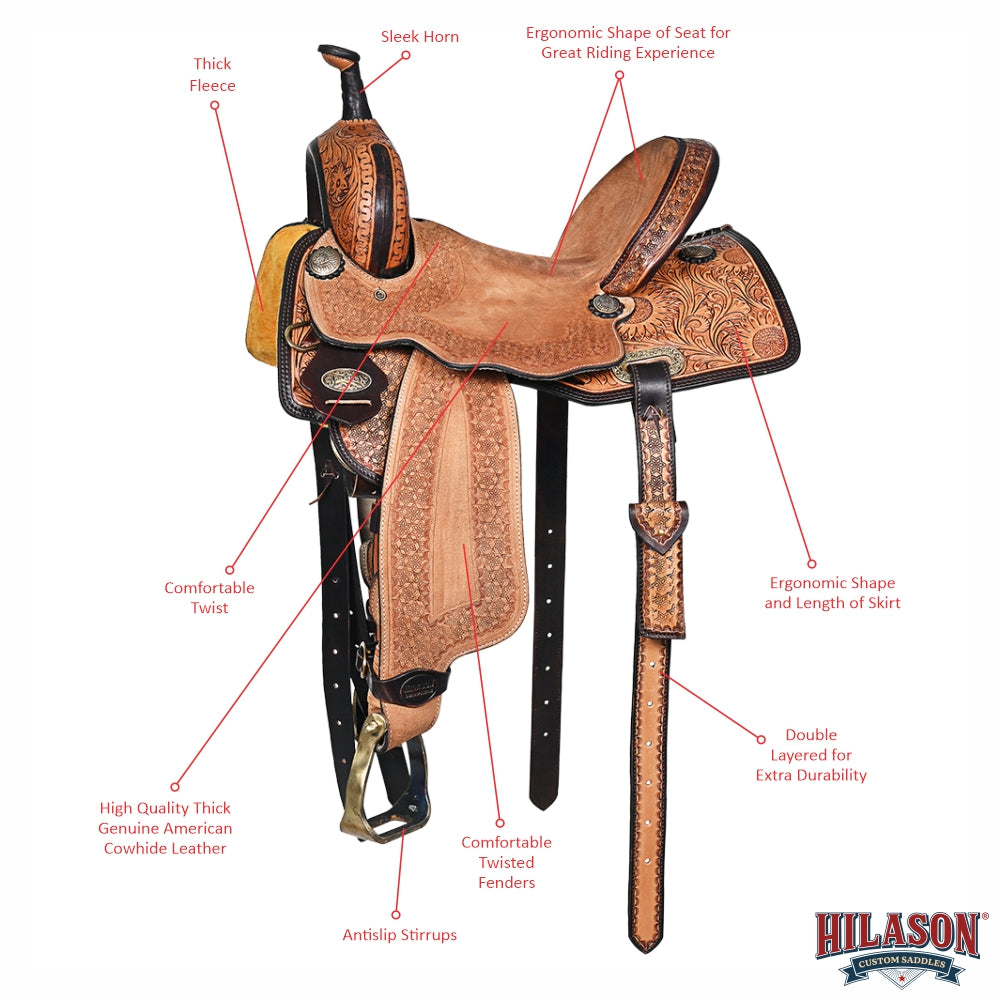 The Saddle Features A State-Of-The-Art Tree That Forms Its Core Foundation. This Tree Provides Excellent Support And Stability Without Compromising On The Horse'S Freedom Of Movement. Its Lightweight Nature Allows For Agility And Quick Response, Enabling Riders To Navigate Tight Turns And Maneuvers With Ease.The HILASON Saddle Boasts Luxurious Leather Craftsmanship That Not Only Enhances Its Visual Appeal But Also Guarantees Durability And Longevity. The Carefully Selected Top-Quality Leather Is Expertly Handcrafted To Create A Sleek And Stylish Appearance, Making It A True Standout.Designed With The Rider'S Comfort In Mind, The Saddle Offers A Secure And Balanced Seat. The Seat Design Allows For Optimal Positioning And Stability, Ensuring Riders Feel Connected To Their Horses During Intense Riding. The Seat Is Thoughtfully Designed To Minimize Pressure Points, Providing Hours Of Comfortable Riding Without Compromising Performance.In Addition, The HILASON Saddle Incorporates Adjustable Stirrups, Accommodating Various Rider Preferences And Leg Lengths. These Stirrups Offer A Secure Grip And Promote Proper Alignment, Aiding In Maintaining Control And Balance Throughout The Ride.
