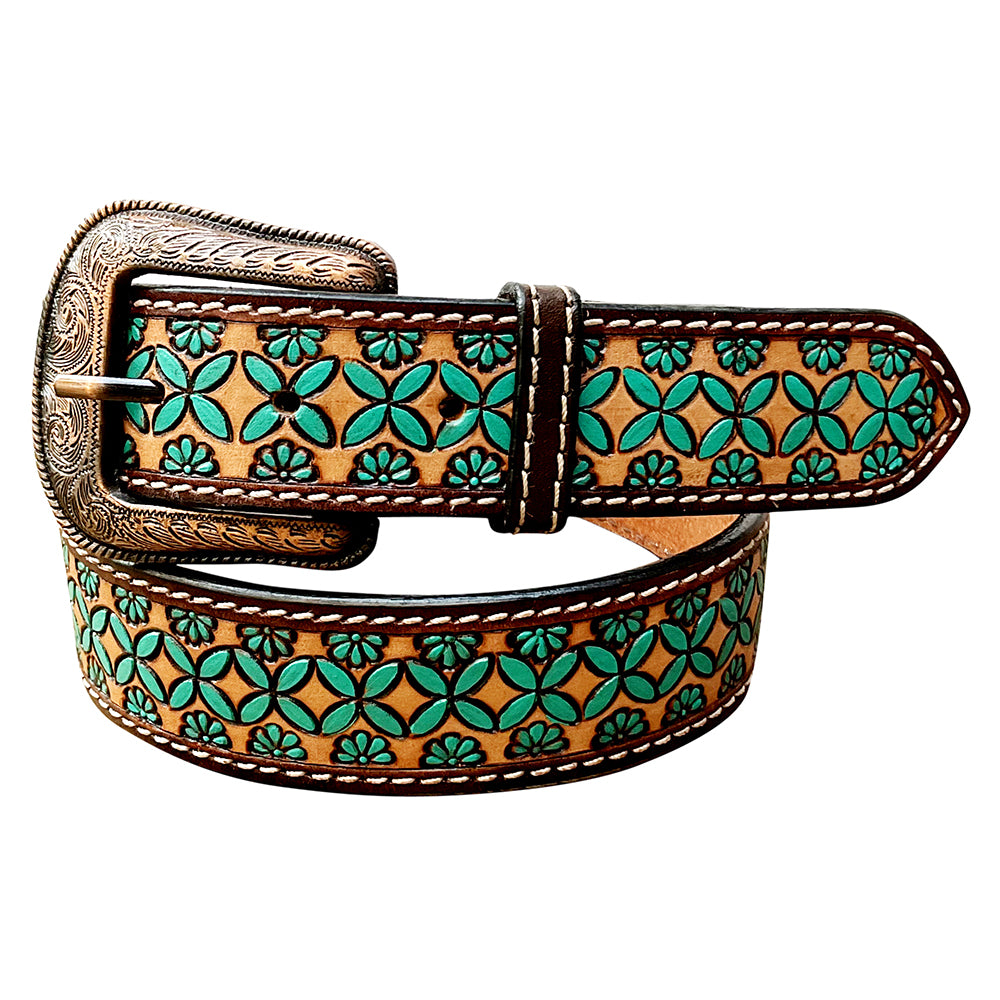 BAR H EQUINE Brown Turquoise Flower Hand Carved Fashion Premium Leather Belt Unisex Western with Removable Buckle