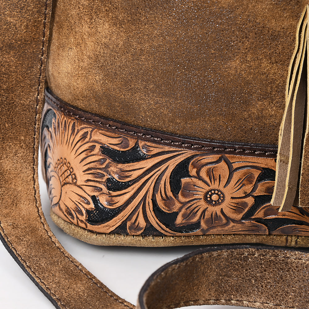 The Detailed Hand Tooling And Carving, Followed By An Antique Hand Finish, Are Exquisitely Done By The Finest Artists And Craftsmen In The Country. The Vegetable-Tanned American Genuine Cowhide Leather Ensures Durability And A Unique Patina Over Time. The Premium Authentic Genuine Suede Leather Is Luxuriously Soft And Pliable, Aging Gracefully With Wear To Showcase Its Enduring Beauty. The Adjustable Genuine Leather Shoulder Strap Allows For A Customized Fit, While The Highly Durable Solid Antique Finish Metal Fittings Ensure Longevity. The Genuine YKK Brand Zippers, Known For Their Durability, Secure Your Essentials Effectively. Adorned With Meticulously Crafted Hand Buck Stitch Edges, This Bag Adds A Touch Of Artistry And Elegance To Your Ensemble.