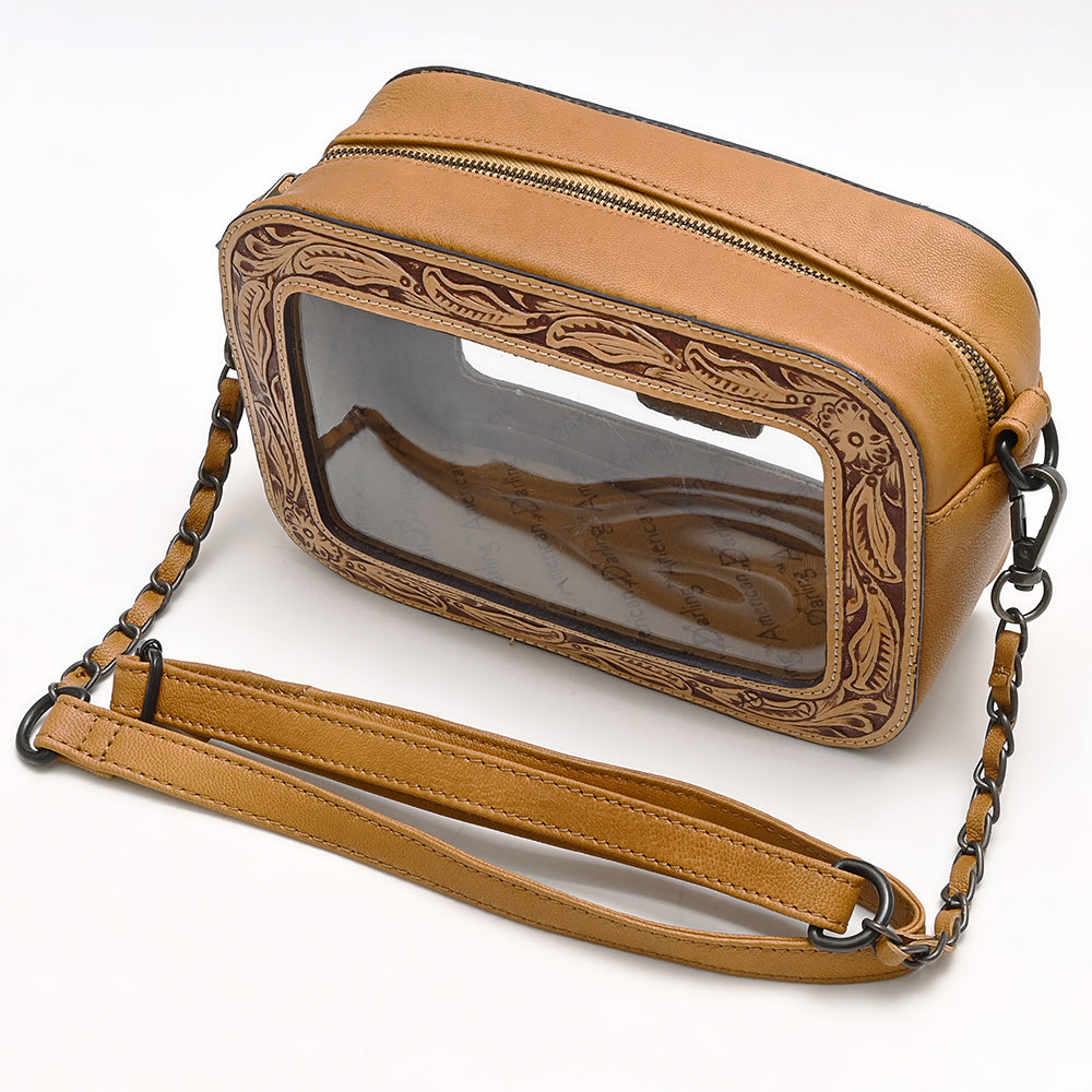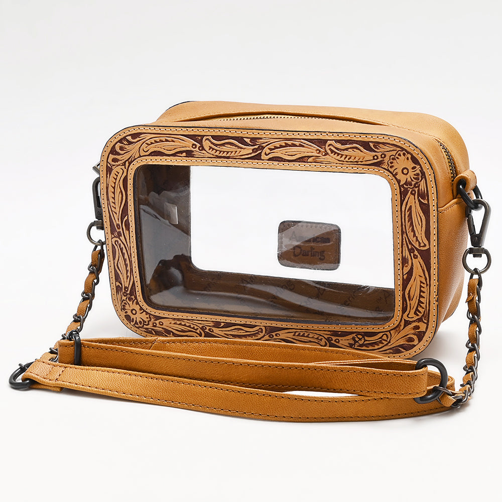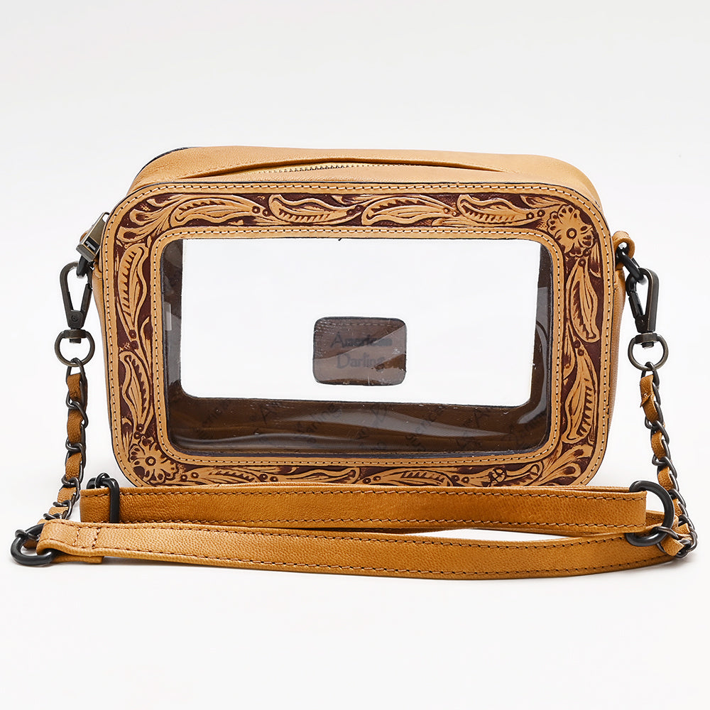 American Darling Clear Crossbody Purse Hand Tooled Tan Leather Trim, Stadium Approved Western Style