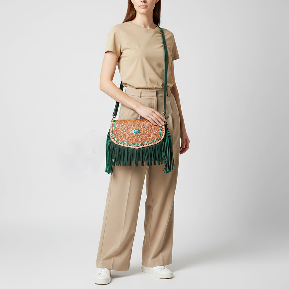 • Premium Quality Material: This Is A Handmade American Darling Women'S Crossbody Bag Made With Hand-Tooled Genuine Leather That Gives It A Traditional Western Yet Trendy And Elegant Look. High Quality Soft And Supple Eco Friendly Vegetable-Tanned Full Grain Genuine Leather Is Also Used To Make This Bag That Ages Beautifully As It Wears. These Crossbody Leather Bags Are Complemented With A Beautiful Leather Fringe Giving It A Western Look. Available In Size: 10In (H) X 13.5In (W)