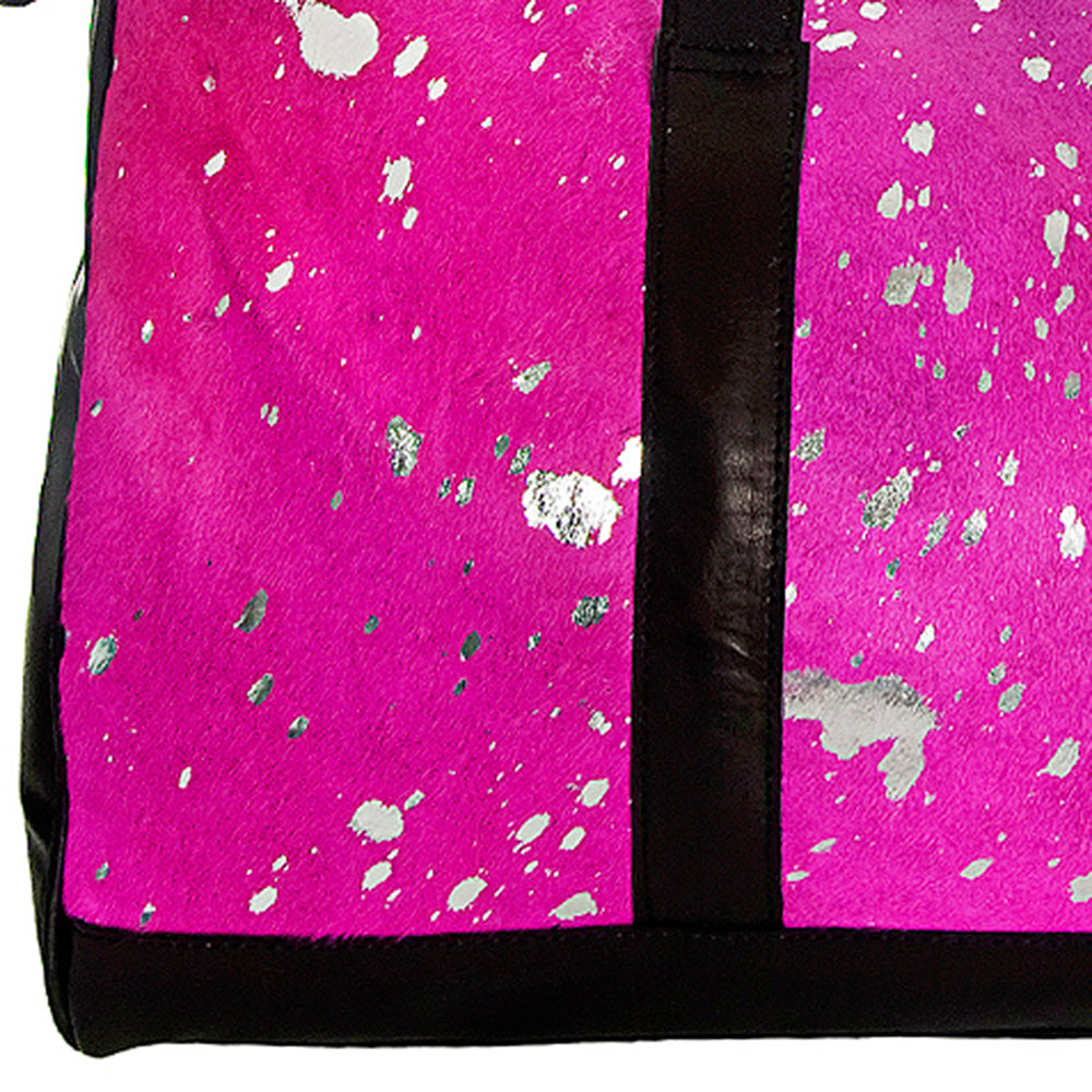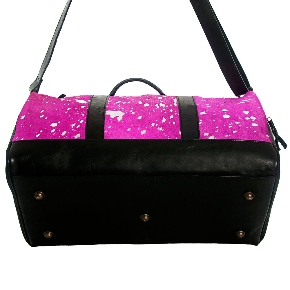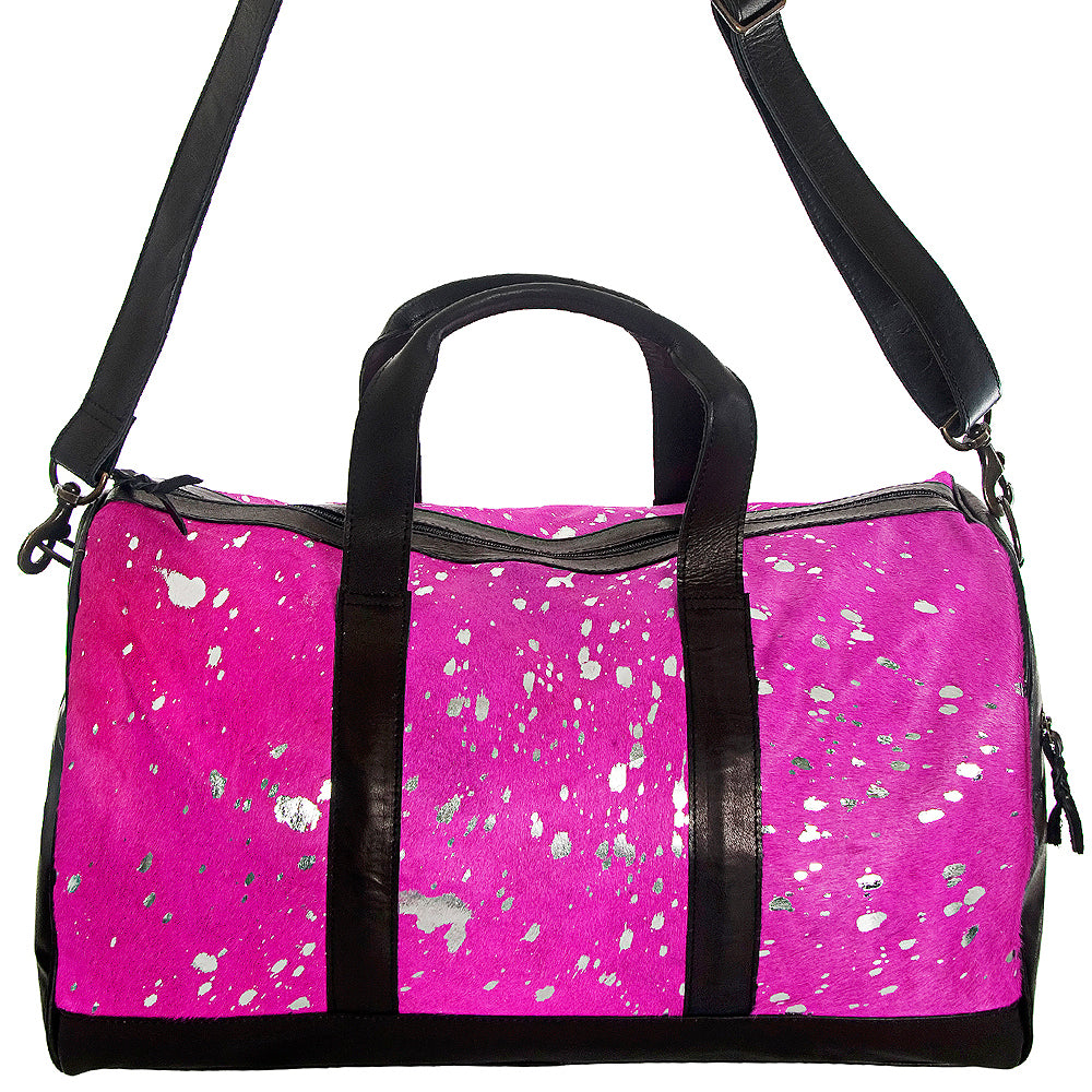 Turn heads wherever you go with the American Darling Handmade Leather Duffle Bag crafted in vibrant pink hair-on leather. Made from premium genuine leather, this bag showcases expert craftsmanship with a bold western aesthetic. The unique metallic splatter accents add a modern artistic flair, ensuring that no two bags are exactly alike and making it a true statement accessory.