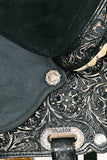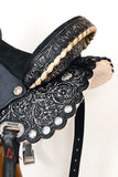 • ✔ Features: This Horse'S Saddle Features A Gorgeous Hand Tooled And Carved Design In A Hand Finished Antique Black Color And Silver Concho Ornaments. Proprietary Designed And Extremely Robust Flex Tree That Fits 6 To 8 Inches Gullet Size Horses. Black Rough Out Seat, Deep 5 Inches Cantle. Anti-Slip Stirrups 26 Inch Skirt Length, Weight, 25 Lbs(Approx.).