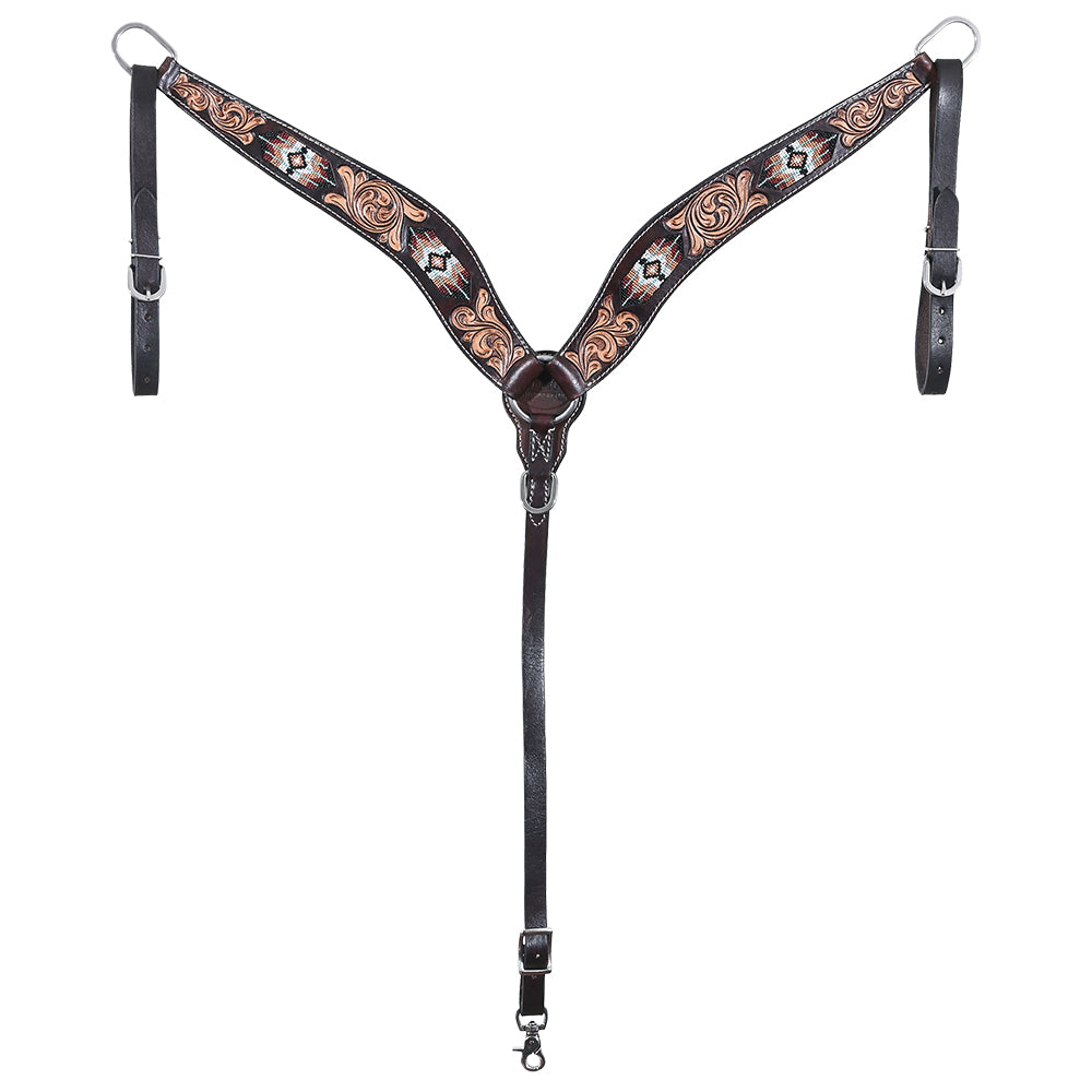 • Features: This Horse'S Breast Collar Headstall Set Features A Gorgeous Floral Hand Tooled And Carved & Meticulous Beadwork In Aztec Design In A Hand Finished Brown Color.
