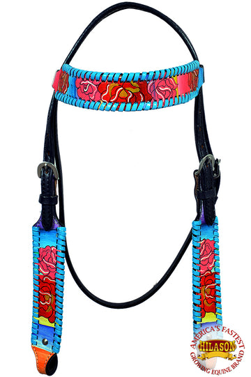 Hilason Western Horse Floral Hand Painted American Leather Headstall Rawhide Braided Turquoise / Brown