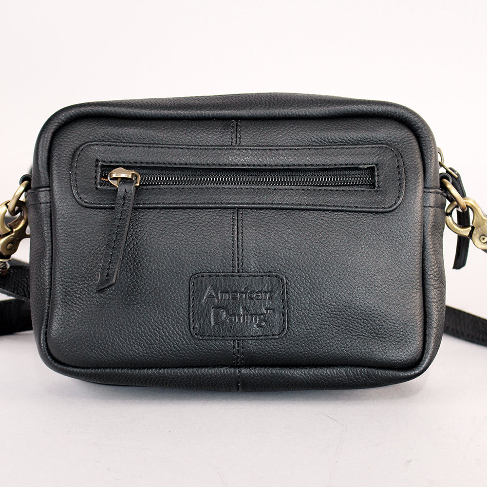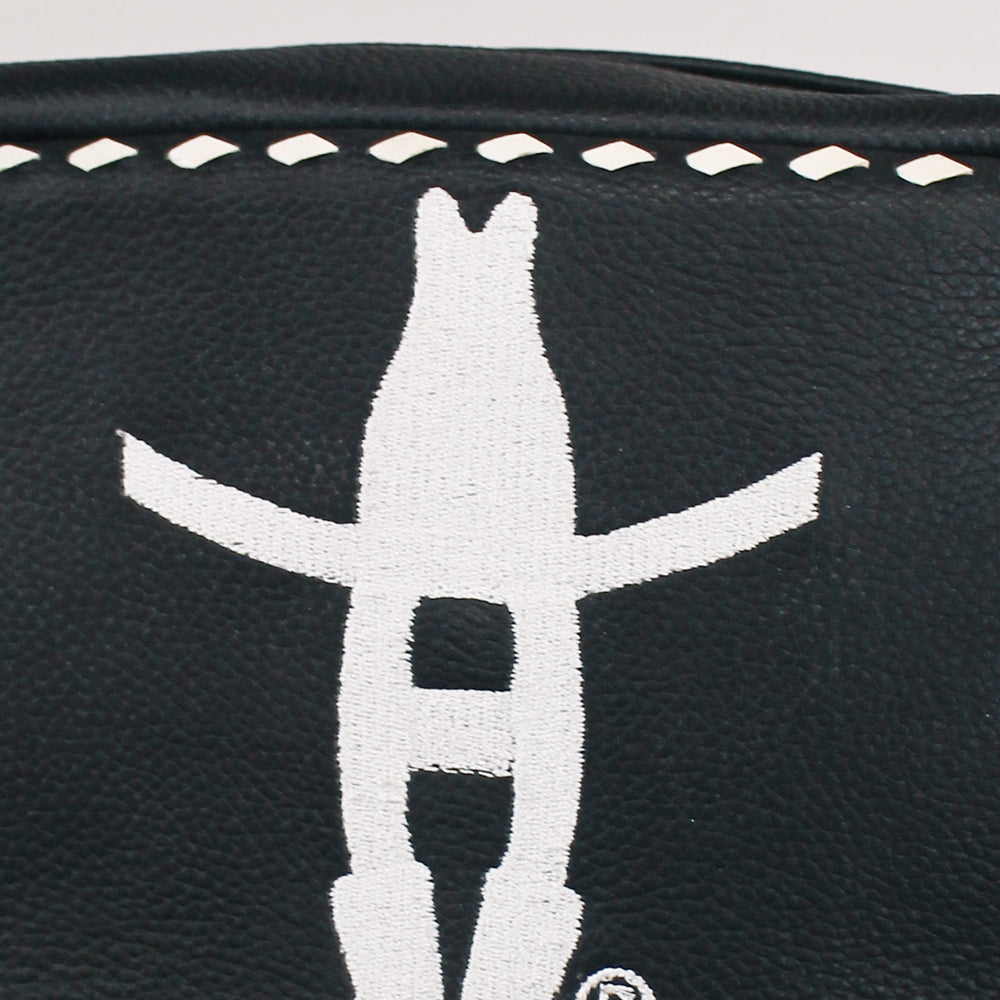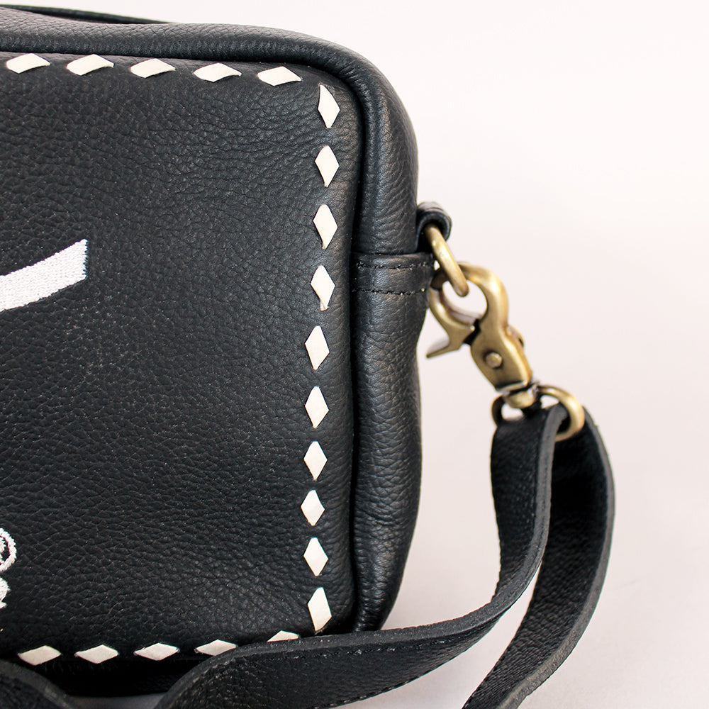 Crafted from premium genuine leather, this crossbody offers durability and structure while maintaining a lightweight feel. The decorative whipstitch trim and bold Western front detailing create a distinctive look that complements denim, boots, and festival-ready outfits.