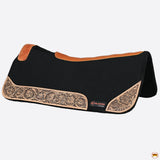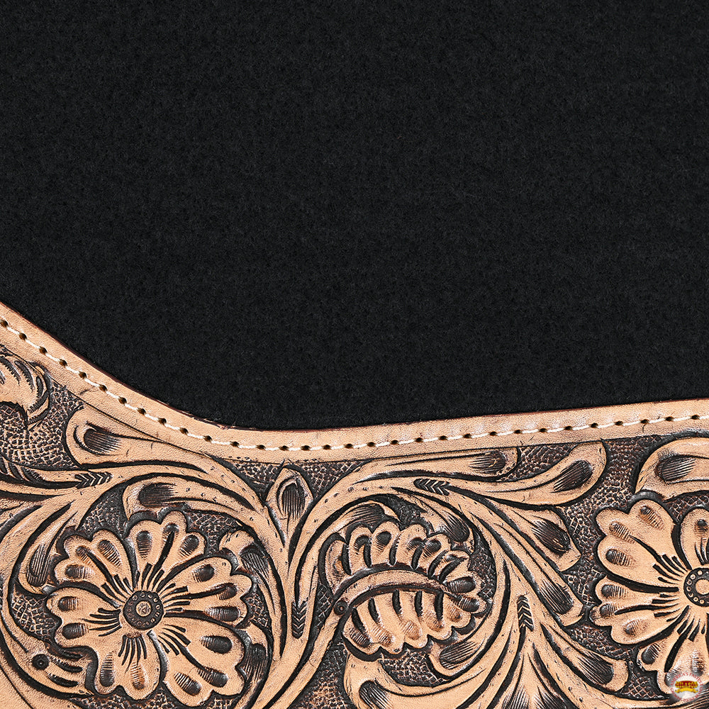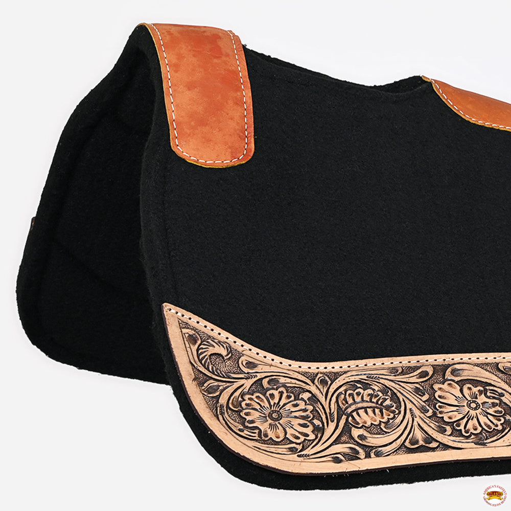 This is a contoured western saddle pad that fits varying horse backs. The split design of the saddle pad into two independent panels enables the pad to move with the horse's movement too. The top layer is of High-Density wool felt with Genuine Wear Leather along the border, and the bottom layer is of high-density wool felt, which gives excellent anti-slip functionality in addition to a cool and comfortable fit to the horse's back. The spine area of this pad is contour-shaped for a perfect fit.