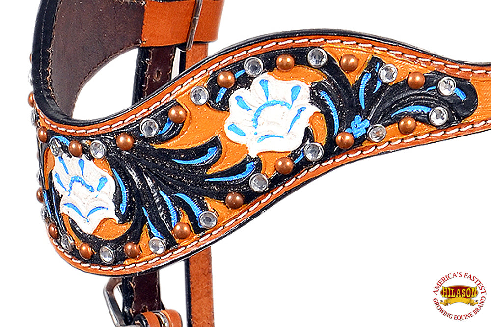 Hilason W. H. Headstall Bridle American Leather Tan Floral Black Inlay