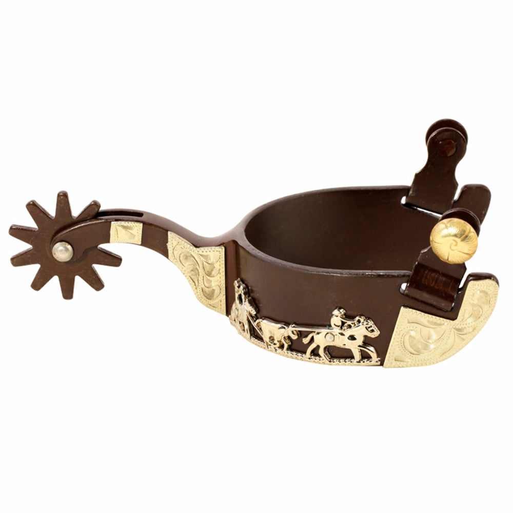 Designed with a substantial 1-1/4" wide heel band for a solid, comfortable fit on Western boots, the spur body features a rich, dark finish. The standout feature is the exquisite Gold Trim and Overlay, which includes intricate scrollwork and a finely detailed scene of a horse and rider—perfect for adding a touch of class to your show attire.