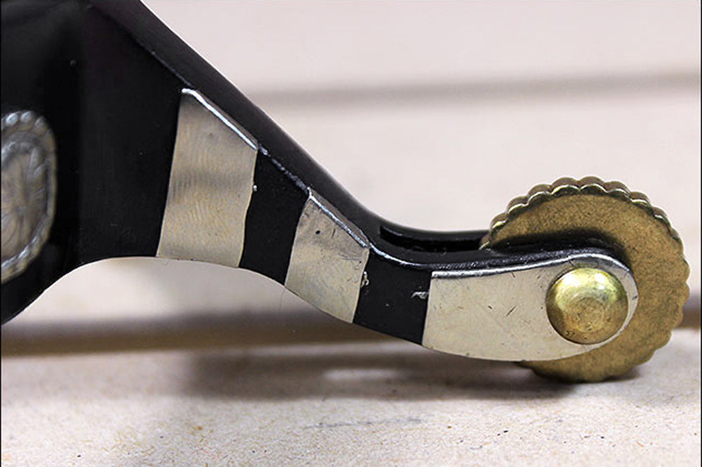 Elevate your show performance with these stunning Hilason Black Steel Mens Show Spurs. Designed to catch the judge's eye, these spurs feature a rich, durable black steel band meticulously inlaid with Engraved German Silver Trim and accented by Triple Silver Conchos. The traditional, smooth shank provides a balanced feel, while the Solid Brass Rowel delivers clear, responsive cues for collection and lateral work. This combination of robust black steel and brilliant silver detail makes this a high-end, eye-catching accessory for any serious Western competitor, ensuring a perfect blend of elegance and precise control.