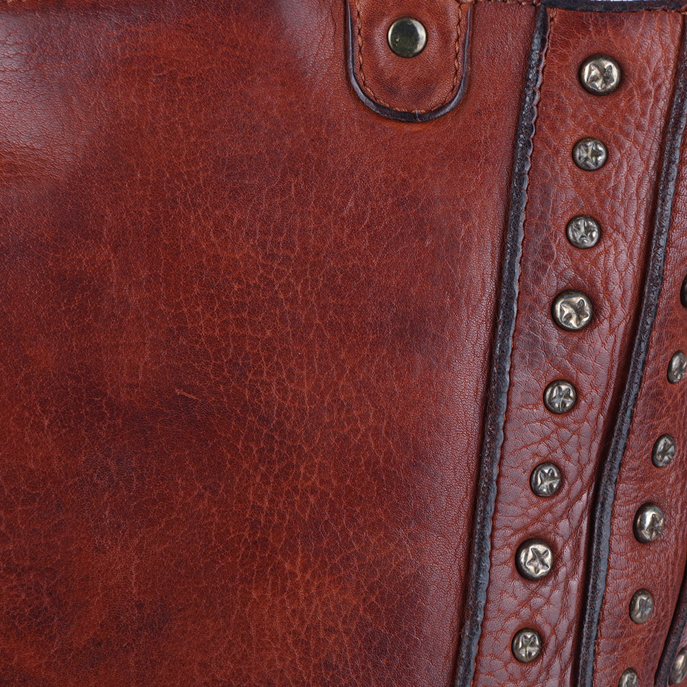 The Spaghetti Western creations undergo a meticulous hand-dyeing process utilizing an individualized method. Each creation is meticulously guided through multiple stages, featuring a proprietary approach involving hand dyeing, buffing, brushing, and finishing. This process demands significant time and attention to detail. Nonetheless, the outcome is a captivating blend of vintage and patina aesthetics, ensuring that each creation possesses its own unique and exclusive appearance.