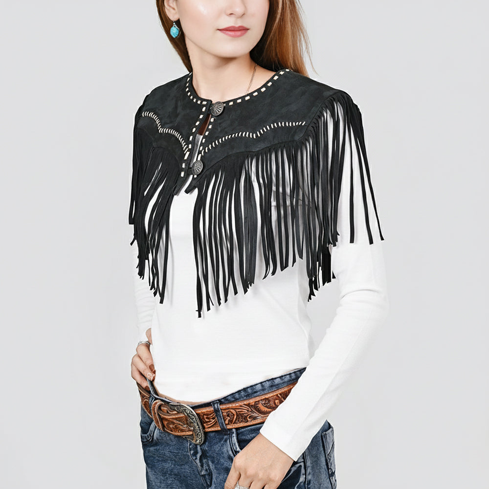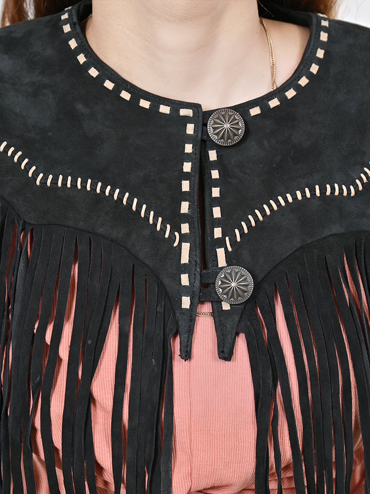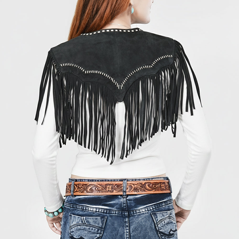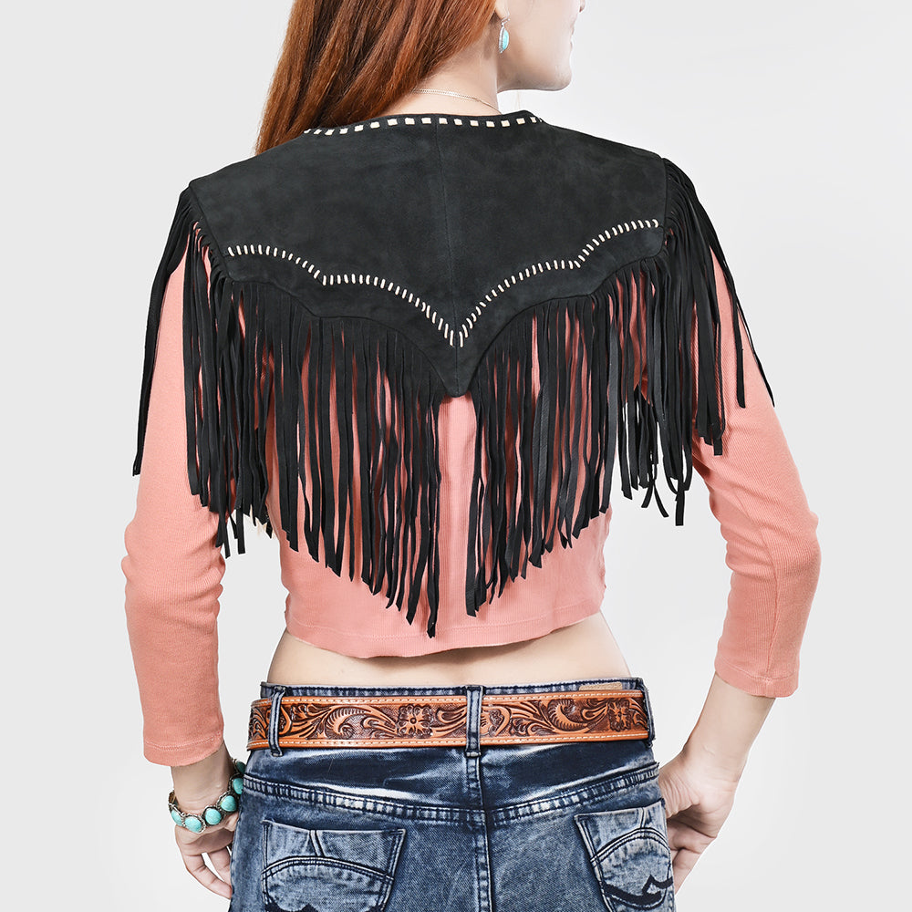Premium Quality Material: This Women'S a Black fringe suede vest with white decorative stitching, This Women'S Dress Offers Superior Comfort And Durability. Light Pink crop top underneath. Each Piece Comes With A Complementary Fabric Duster Bag, Perfect For Protection And Stylish Storage.Feature-: A Luxurious And Western Handcrafted Dress Collection Designed Here In The Heart Of Texas. These Gorgeous Creations Deliver A Blend Of Western Culture And Heritage Along With The Latest Fashion And Trendy Appeal. This Shirt Make Your Appearance Eye-Catching With Their Amazing Colors, Materials, And Meticulous Handwork. Eco-Friendly Dress Is Handpicked And Sourced From Some Of The Best Tanneries In The World.